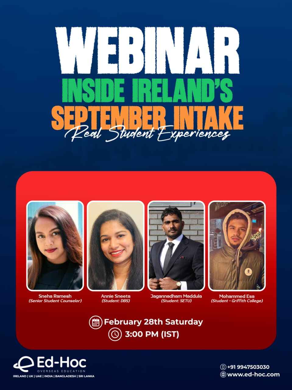 A webinar was conducted on the topic “Inside Ireland’s September Intake – Real Student Experiences” to provide valuable insights for students planning to pursue higher education in Ireland. The session featured experienced counselors and international students who shared their real-life experiences about studying abroad, including the application process, university life, visa procedures, part-time work opportunities, and career prospects after graduation. The webinar aimed to help aspiring students gain a clear understanding of the opportunities available for the September intake and prepare confidently for their study journey in Ireland. 🎓