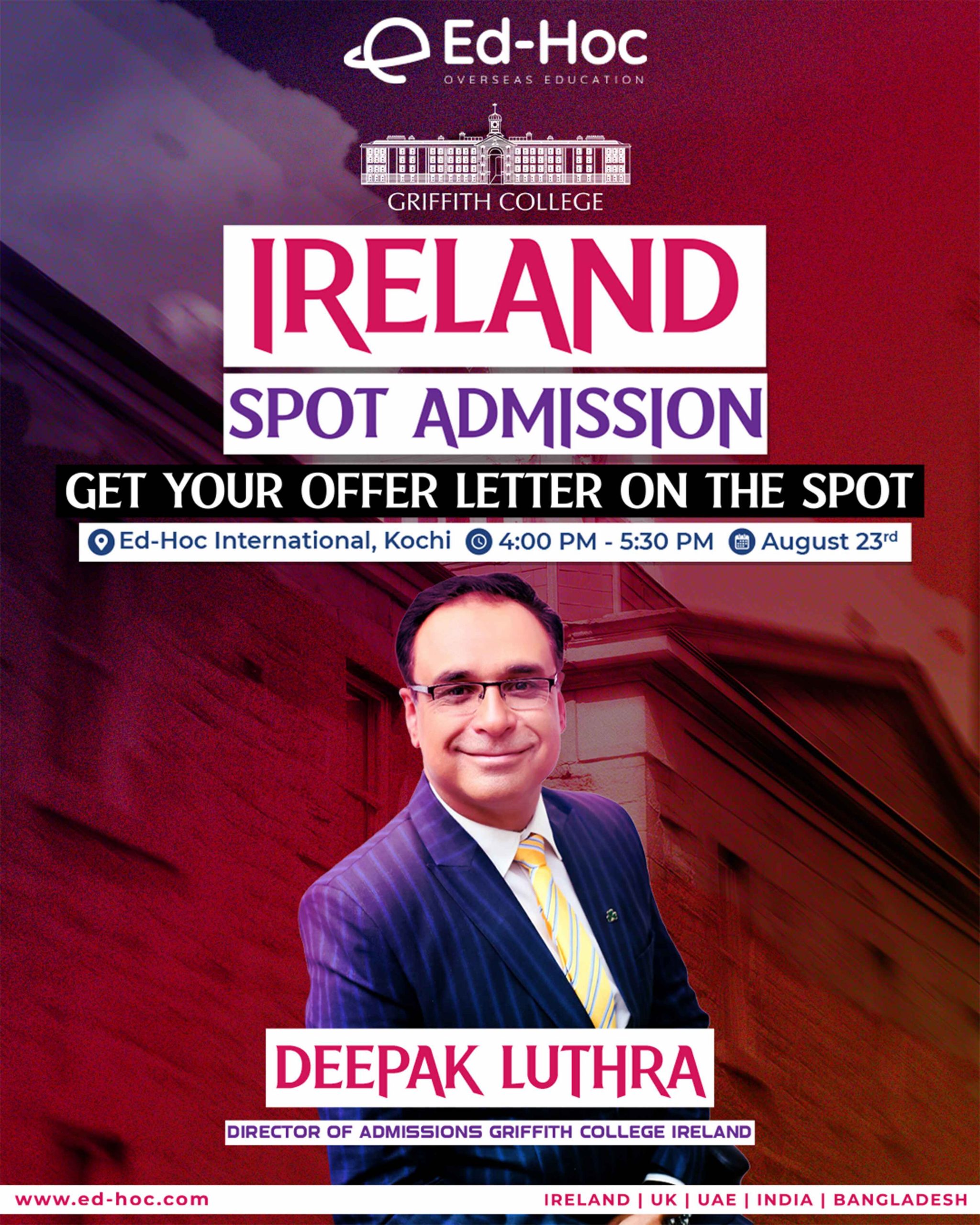 On August 23rd, Ed-Hoc International hosted an exclusive and highly impactful Ireland Spot Admission event at their Kochi office, offering students a unique opportunity to fast-track their study abroad dreams. The session featured Deepak Luthra, the esteemed Director of Admissions at Griffith College Ireland, who engaged directly with aspiring students and provided personalized guidance on academic pathways, career prospects, and the advantages of studying in Ireland.