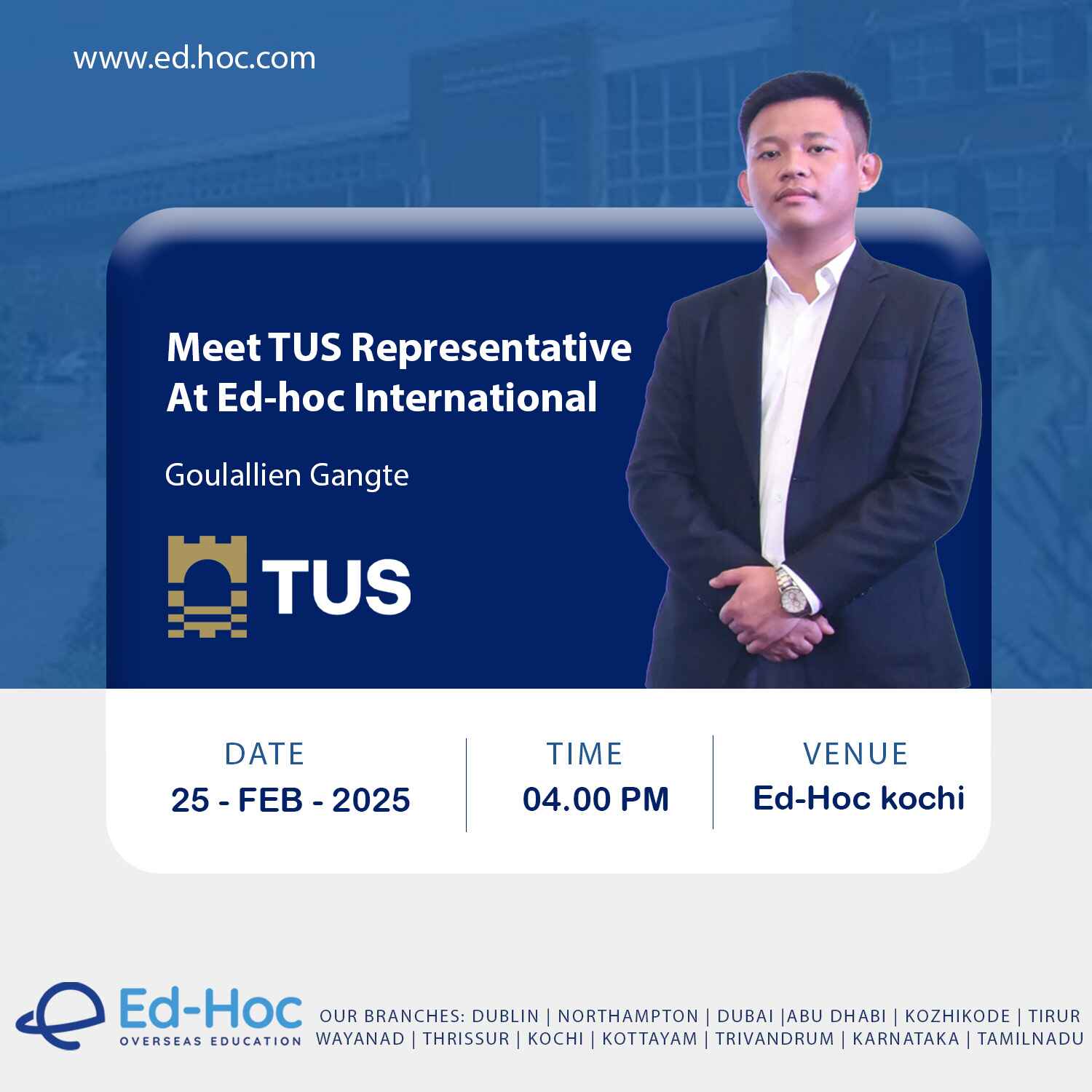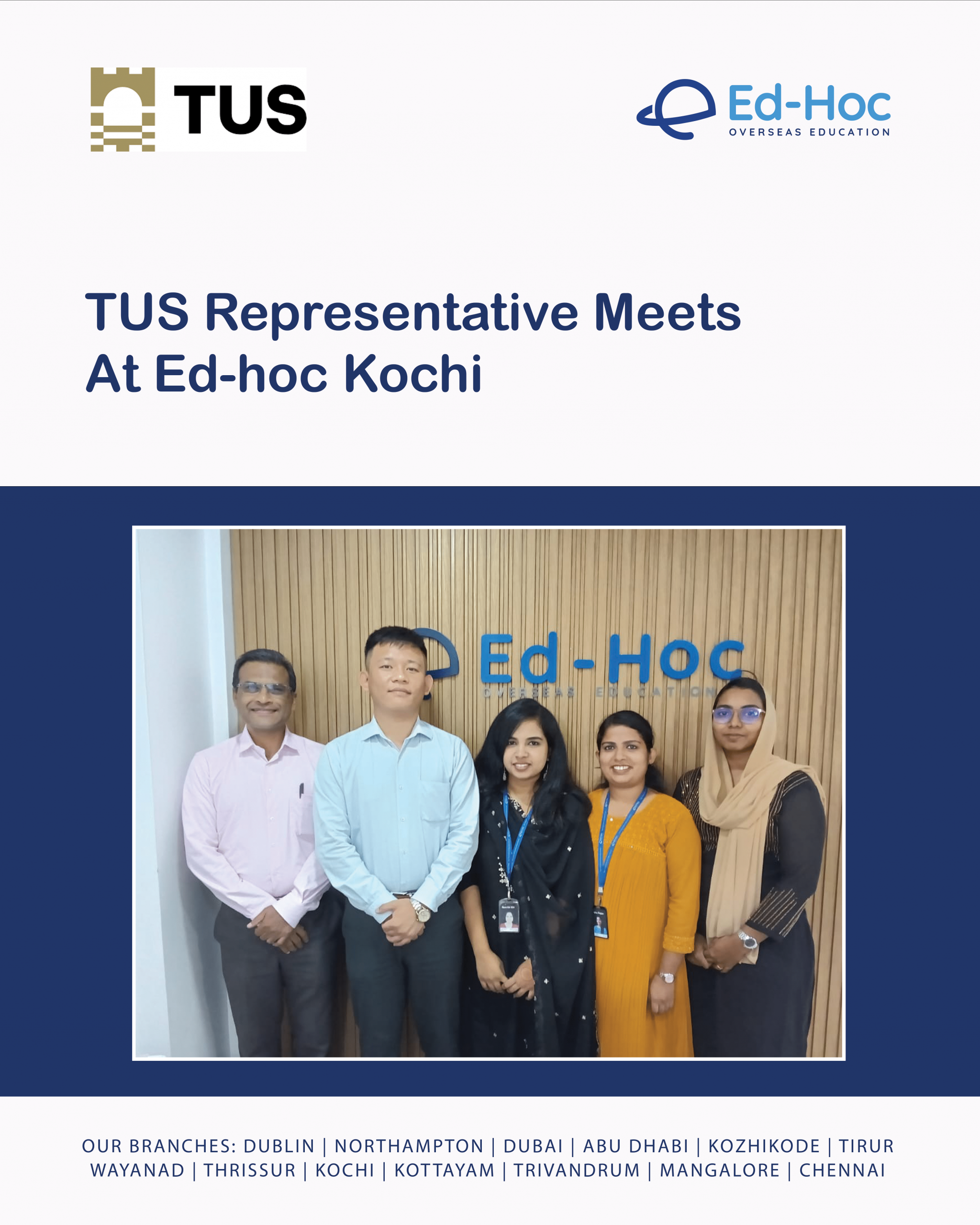 Ed-Hoc International is hosting an exclusive interaction session with a representative from the Technological University of the Shannon (TUS) on 25 February 2025 at 4:00 PM at our Kochi branch. Students interested in studying in Ireland can explore courses, admission requirements, scholarships, and career opportunities directly from the university. Don’t miss this chance to get expert guidance for your abroad education journey.