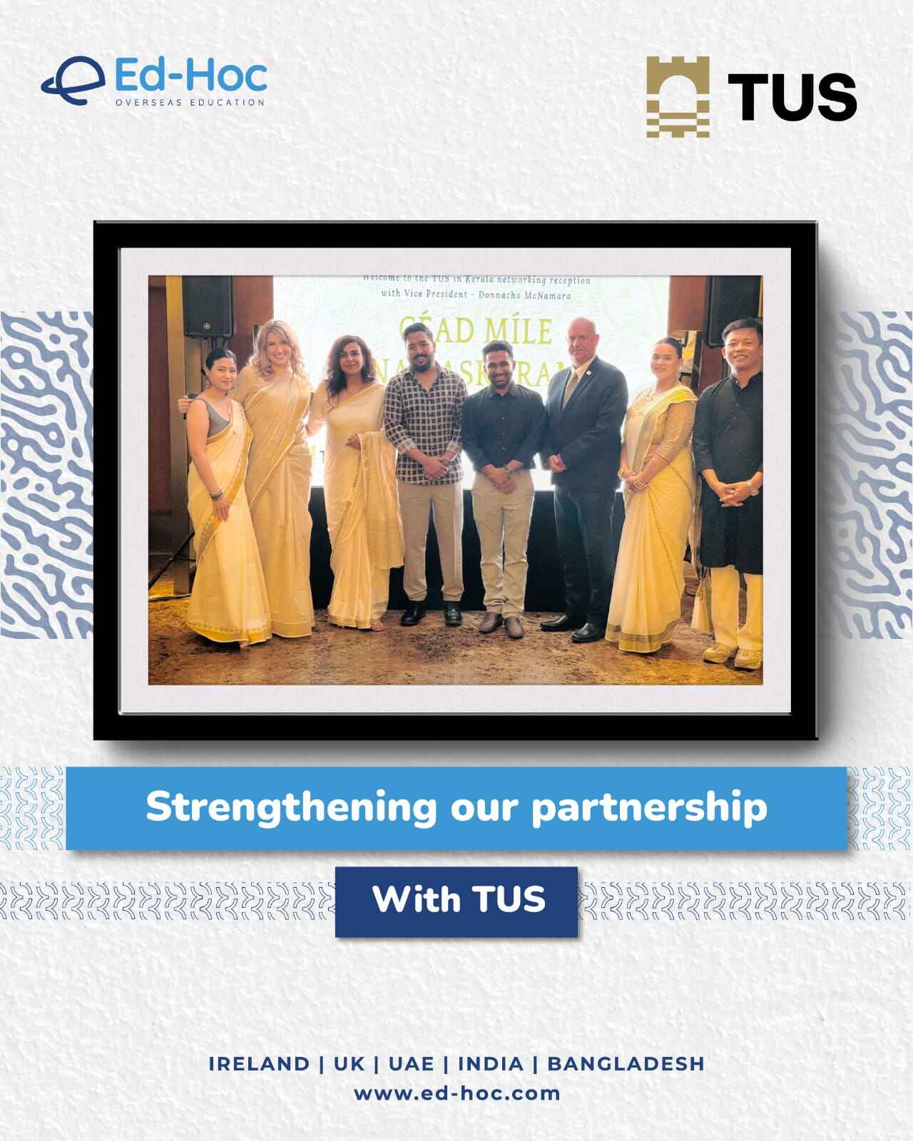 Ed-Hoc Overseas Education is proud to strengthen its collaboration with TUS, a dynamic Irish university known for its practical learning, industry-focused programs, and strong support for international students. This partnership enables learners from India, the UAE, Bangladesh, and the UK to access quality education in Ireland with expert counselling and a seamless admissions pathway. Through our continued collaboration with TUS, we remain committed to creating global opportunities and empowering students to build successful international careers.