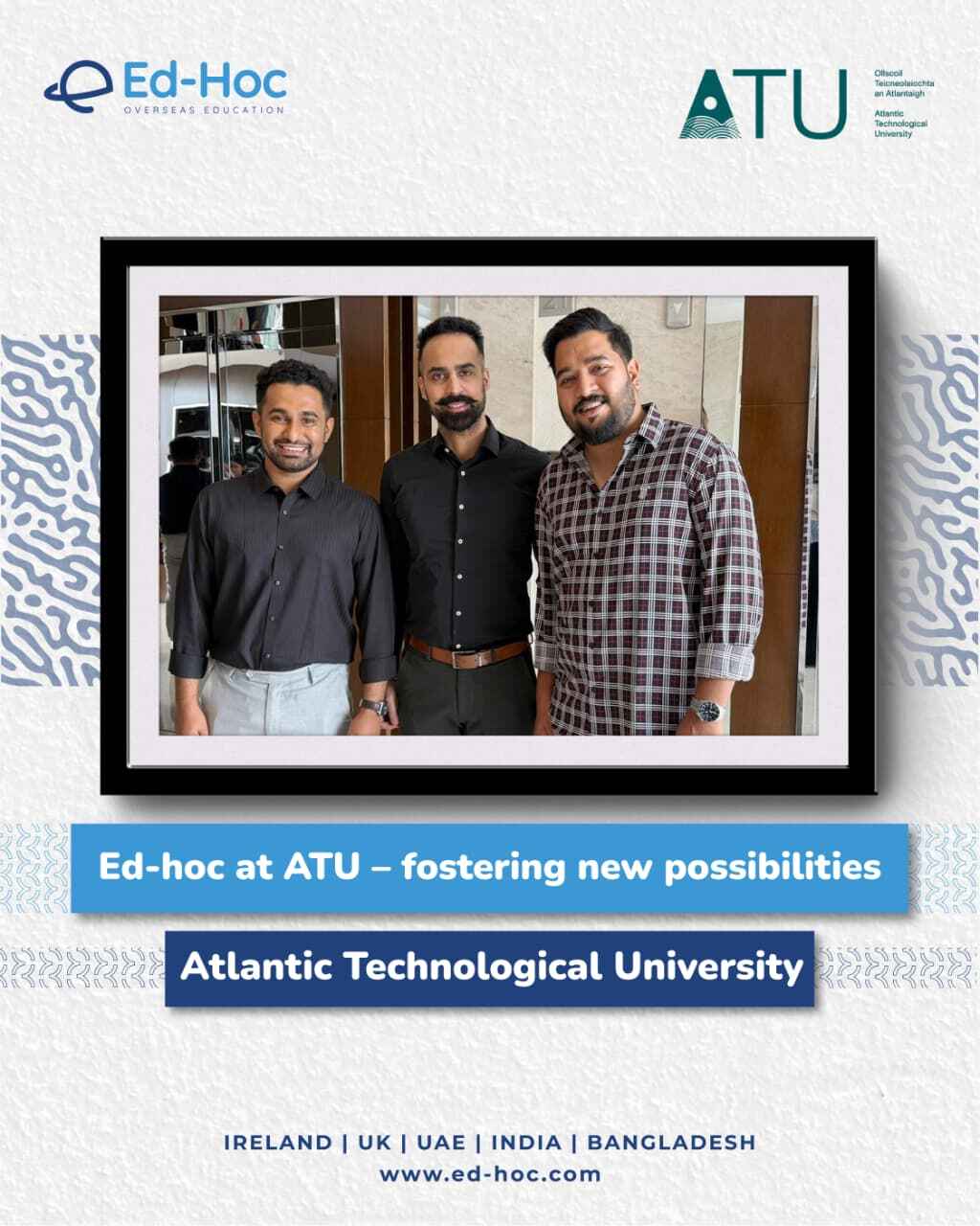 Ed-Hoc Overseas Education is proud to strengthen its collaboration with ATU, a dynamic Irish university known for its practical learning, industry-focused programs, and strong support for international students. This partnership enables learners from India, the UAE, Bangladesh, and the UK to access quality education in Ireland with expert counselling and a seamless admissions pathway. Through our continued collaboration with ATU, we remain committed to creating global opportunities and empowering students to build successful international careers.